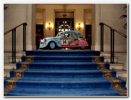 Following on from news that Zoe's car would be displayed at the RAC club in Pall Mall, here is a picture that Zoe has sent in of the car on display, as seen from the steps leading from the main entrance. Quite impressive, I think you'll agree! |