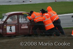 As the race moved on to lap 11, the skies darkened somewhat, and the spectators and drivers alike were treated to a brief shower of hailstones! The first car to take to the scenery was the 17 car of Peter James, who ran wide at Brooklands corner. It wasn't long until he was followed by the 97 Fine Print car of Martin Harrold. Although the conditions were worsening at the end of the lap, it became clear that the first 2 corners were relatively unaffected by the surprise change in weather, and this caught a number of drivers out, with Richard Hollis running very close to the edge at Brooklands, and Trevor Williams sliding into the gravel on the outside of Luffield corner. The 52 Cowell/Sadler car also came to grief at Brooklands, but was able to carry on. A sideways car at Luffield slowed the number 24 car of Neil Thompson, which was then collected in the rear by Matt Riley. Richard Hollis went wide and ended his race in the gravel on the outside of Luffield, promoting Phil Myatt up to 2nd, Andrew Pirt to 3rd, and Sammie Fritchley up to 4th. Meanwhile, Pete Sparrow was looking like a dead cert for the win, with quite a comfortable margin up at the front of the race, passing the lapped cars without incident. The marshals were out on track on lap 13 at Luffield, trying to free the stricken number 4 car of Trevor Williams, but it was stuck fast. Andrew Pirt was trying a few different lines and getting his car sideways. Out of sight, he dropped a few places, handing the 3rd place to Sammie Fritchley. Meanwhile, the number 14 car of Callendar/Byatt was starting to look strong, and the battle for 2nd place was beginning to get rather close.