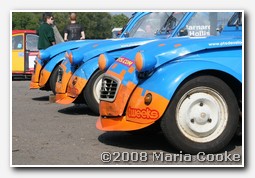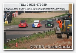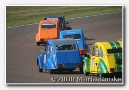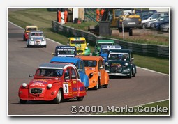 As the competitors arrived at a sunny Mallory Park in Leicestershire, Phil Myatt had a healthy 123 point lead over 2nd place man Andy Smith, with Matt Riley and Mark Turner 180 and 185 points down on Myatt respectively. With 100 points on offer for a win, and two races on the Sunday, it wasn't really time for Phil to relax! Mallory also saw a welcome return for "Wee Fiona" - one of the oldest cars racing in the championship. Recently repainted in the Hollis Motorsport colours (their 3rd car) it was piloted by Nigel Hollis in race one, and Frank Barnard in race two, carrying the number 70. After qualifying for race one, Neil Thompson was rather startled to be on pole - his first! Myatt would start 2nd, and Cowling 3rd. As the race got under way, Neil held the tighter inside line, and so Myatt went around the outside of the first corner, Gerrards. Cowling lost some ground, and Richard Hollis was holding on to the shirt tails of the two cars in front for 3rd. Around the back of the circuit, there were cars flying everywhere. Thompson was mugged at the hairpin, and at the end of lap one, Myatt was in the lead, followed closely by Martin Hindley up from 7th on the grid! Sandro Proietti moved up to 3rd, Thompson was 4th, Cowling 5th and Rich Hollis in 6th.Neil promptly got past Proietti on the next lap. Sammie Fritchley stormed past Rich Hollis to take 6th, up from 17th on the grid - a superb opening 3 laps for her! The lead three (Myatt, Hindley, Thompson) then developed a bit of a gap to the next bunch on lap 4, which was comprised of Cowling, Proietti, Fritchley, Pirt and Callandar - the latter two separated by inches. For the next 4 laps, the order remained the same. The top 3 formed a pack, as did the next 3, then the next 5. The pack split up into races within the race - each as hard fought as the others. Rich and Matt Hollis were dicing hard for 10th place on lap 8, as Jack Gabriel pitted with problems, which kept him out of the race for the next 8 laps. By lap 12, Andy Smith had worked his way up to 9th, displacing Andy Pirt. Aubrey Brocklebank had fought his way into 10th. Smith then had a 4 lap battle with Christian Callandar - the two of them swapping places almost every lap. Callandar was also trying to get past Greg Wheeler, who was at the front of their bunch, and he managed it on lap 15, demoting Wheeler to 9th, and Smith followed Callandar through to take 8th. Neil Thompson set fastest lap on lap 16 and Aubrey got past Andy Pirt on lap 18. Sandro Proietti made a bid for 4th place on lap 21, and it paid off, demoting Wayne Cowling to 5th. Behind them, Sammie Fritchley was all on her own in 6th, and then another pack of cars, led by Callandar. Yellow flags were being shown at the Esses. The yellows were brought in by the next lap, and lap 22 was to be the last. At the front, the battle was still raging between Myatt, who just had the nod from Hindley, then Thompson. Proietti was 4th after a gap, then Cowling, then Sammie still on her own. Callander was still holding on for 7th, ahead of a bunch of cars including Andy Smith, Greg Wheeler, and Rich Hollis. As the first three cars came around the hairpin for the final time, it was neck-and-neck. They fanned out 3 abreast through Devil's Elbow, and as they approached the line it could have gone to any of them. The chequered flag flew, and no one could pick a winner, not even the commentators!After a short time, the timing screens showed that Hindley had taken the win, just 0.056 seconds from Myatt, who was 0.088 seconds from N Thompson! It was literally a photo finish, with only a bumper's width separating the top 3. Sandro Proietti came in 4th (an impressive debut). 5th was Wayne Cowling, then Sammie Fritchley, then Christian Callandar in 7th, Andy Smith 8th, Greg Wheeler 9th, Andy Pirt in 10th, Aubrey Brocklebank in 11th, Matt Hollis 12th, then Rich Hollis, Helen Deeley 14th, Matt Riley 15th, Graham Harper 16th, Then Nigel Hollis. Mark Turner was a non-finisher after 19 laps. Jack Gabriel was not classified after only 14 laps completed. Darren Baker and Steve Sadler did not finish, with Baker completing just 12 laps and Sadler not completing any.Download results in .PDF format: http://www.tsl-timing.com/barc/2008/83821.pdf Gallery: http://www.2cvracing.org.uk/gallery/10-mallory08